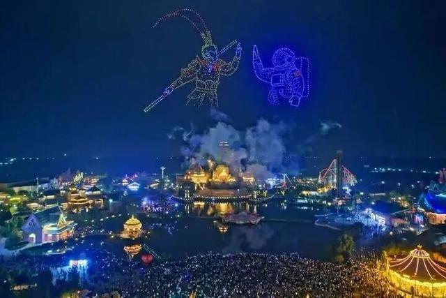 淮安西游乐园“千机共舞·西游星河”,根据节日主题,定制无人机专属表演内容。在刚刚过去的国庆中秋假期,推出“家国团圆”主题无人机秀,1600架无人机同步升空,组成“我爱你中国、盛世华诞、璀璨中国、闪耀中国红”等文字与造型,为市民游客带来“空中诗篇”般的视觉盛宴。