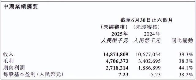 中期财报显示,公司上半年收入148.7亿元,同比增长39.3%;毛利47.1 亿元,同比增长38.3%;净利润27.2亿元,同比增长44.1%,增速远超行业平均水平。