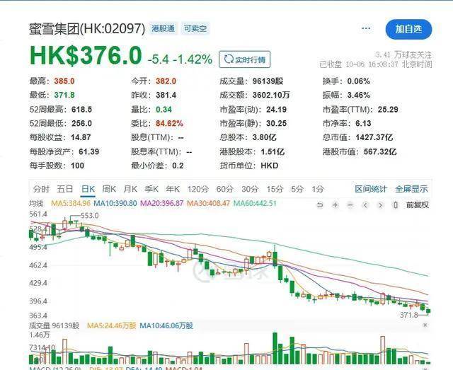 从3月敲钟港交所,开盘市值突破千亿港元,到6月股价冲高至618.5港元/股的巅峰,再到10月6日收盘时市值缩水至1427亿港元,仅仅三个月,蜜雪冰城(2097.HK)的股价遭遇 “腰斩式” 下跌,较7月初蒸发了500亿港元。